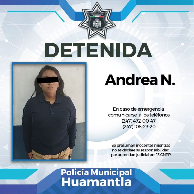 Ante estos hechos, policías de Huamantla detuvieron a Andrea N. de 20 años de edad, por el presunto delito de robo, a quien le leyeron sus derechos para luego ser presentada ante la autoridad correspondiente para que determine su situación legal.