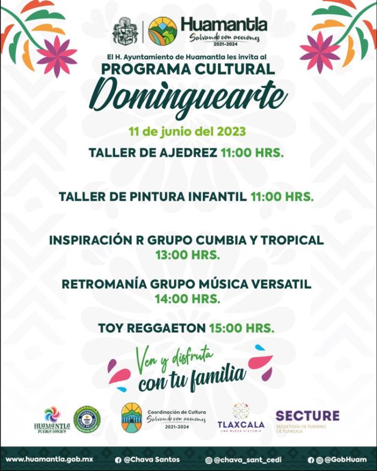 DebatePúblico.- Como parte de las actividades culturales de cada domingo, se llevará a cabo una edición más de “Dominguearte”, un programa que impulsa el gobierno municipal de Huamantla, mismo que se ha convertido en el escenario principal para artistas y grupos musicales.