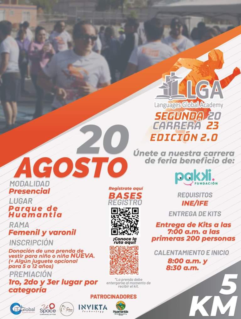 DebatePúblico.- En el marco de la Feria Internacional del Arte Efímero y la Dalia, el gobierno municipal de Huamantla que encabeza Salvador Santos Cedillo, invita a las y los huamantlecos a participar en la segunda edición de la carrera Languages Global Academy 2023, el próximo 20 de agosto a las 8:30 de la mañana en el Parque Juárez de la ciudad.