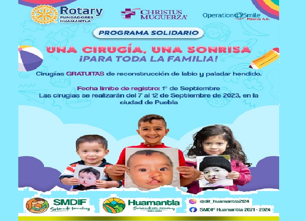 DebatePúblico.- El Sistema Municipal para el Desarrollo Integral de la Familia (SMDIF) Huamantla, en conjunto con el Club Rotary Fundadores de Huamantla, Christus Muguerza y Operation Smile, brindarán el apoyo de cirugías gratuitas de reconstrucción de labio y paladar hendido a niñas, niños, jóvenes y adultos de bajos recursos, bajo el programa solidario “Una Cirugía, una sonrisa”.