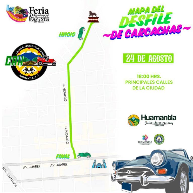 Más tarde, por la formación de contingentes, quedará bloqueado momentáneamente el bulevar Yancuitlalpan. El desfile iniciará desde el Monumento al Toro y recorrerá la calle Hidalgo hasta el Parque Juárez, donde se concentrarán todos los autos, ahí familias podrán tomarse la foto con los pilotos y sus vehículos.