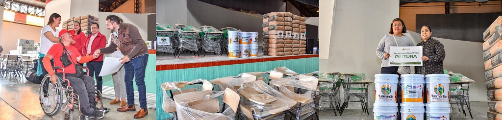 En el Centro Cívico de Huamantla, el edil Salvador Santos, hizo entrega de mobiliario escolar, materiales de construcción como láminas, botes de pintura, tinacos, y malla sombras a diversas instituciones educativas del municipio, así como equipos de cómputo a los estudiantes con mejores promedios de nivel Medio Superior.