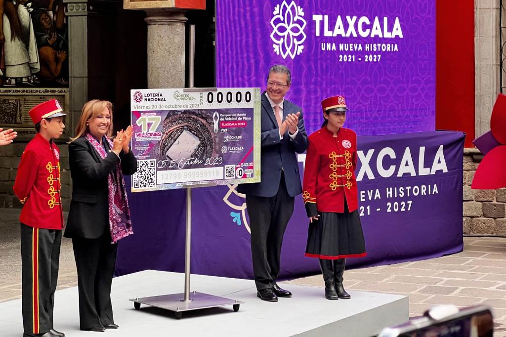 DebatePúblico.- El presidente municipal de Huamantla, Salvador Santos Cedillo, asistió al evento de Develacion del «Cachito de Lotería» alusivo al Campeonato Mundial de Voleibol de Playa Tlaxcala 2023, hecho que quedará plasmado en la historia de nuestro país con la impresión de 60 mil billetes de Lotería