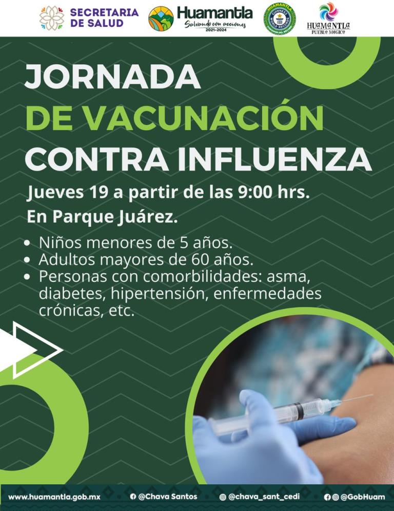 DebatePúblico.- El H. Ayuntamiento de Huamantla, que preside Salvador Santos Cedillo, informa que será el jueves 19 de octubre que se llevará a cabo la Jornada de Vacunación Contra la Influenza, por parte de la Secretaría de Salud (SESA) de Tlaxcala.
