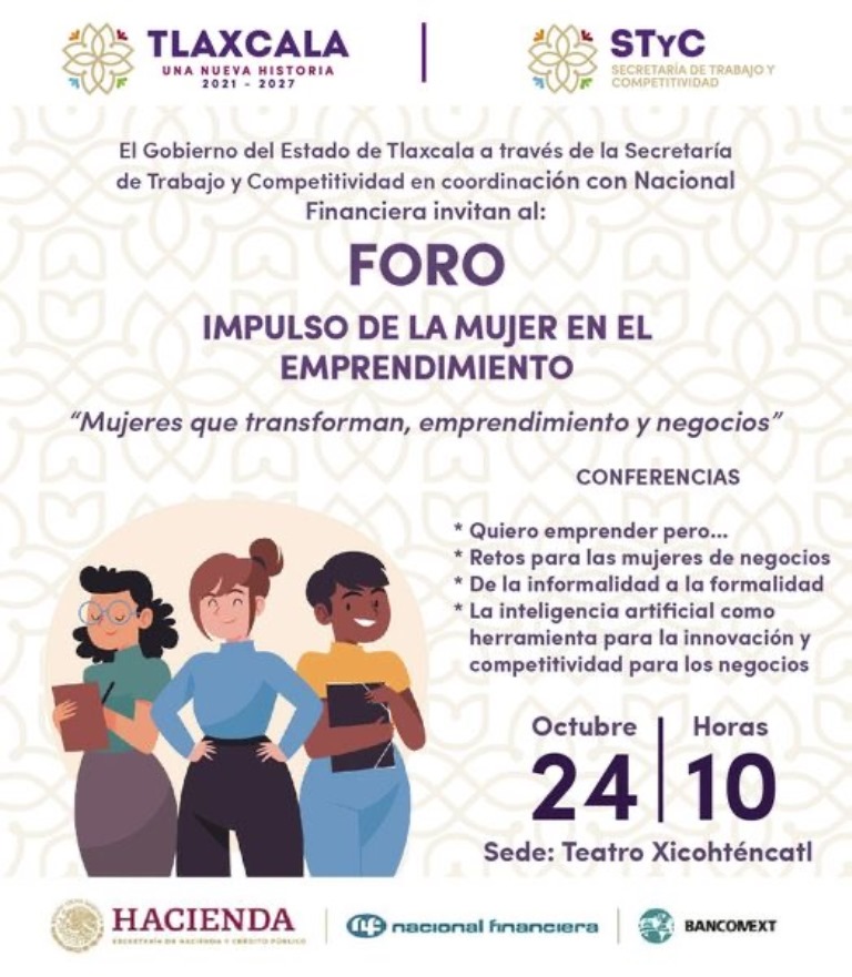 - El gobierno municipal de Huamantla invita al Foro “Impulso a la Mujer en el Emprendimiento”, que organizan dependencias estatales y federales.