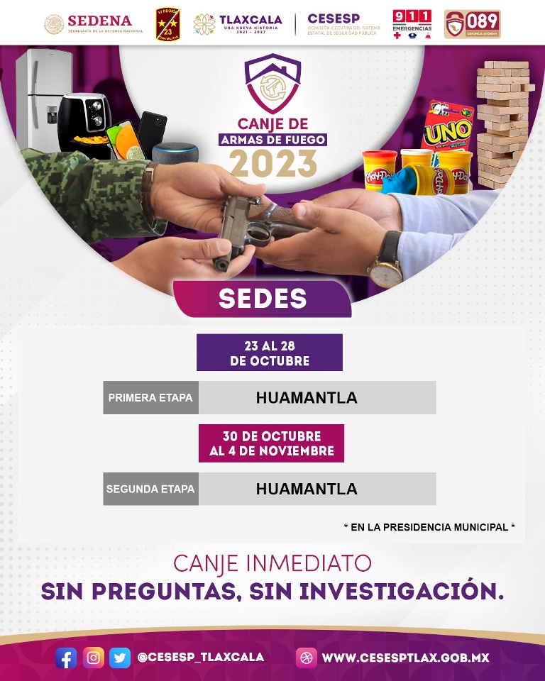 DebatePúblico.- El H. Ayuntamiento de Huamantla, a través de la Comisión Ejecutiva del Sistema Estatal de Seguridad Pública (Cesesp) Tlaxcala, dió inicio a la primera etapa del Canje de Armas 2023, misma que se llevará a cabo del 23 al 28 de octubre en el Parque Juárez frente a Ex- Cancha 13.