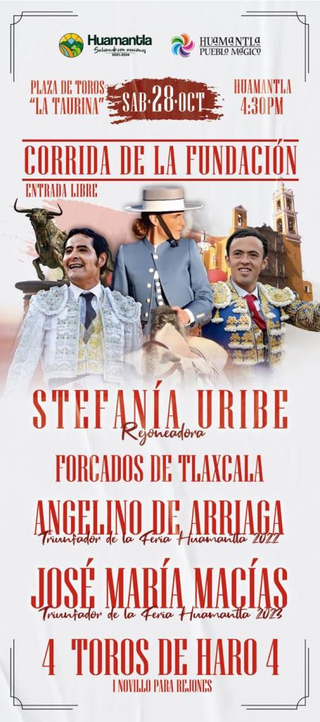 El cartel de corrida estará a cargo del matador Angelino de Arriaga, quién fue triunfador de la Feria Huamantla 2022; el torero José María Macias, originario de este Pueblo Mágico y con una larga herencia taurina; además se tendrá la participación especial de la rejoneadora mexicana Stefanía Uribe, con los Forcados de Tlaxcala.