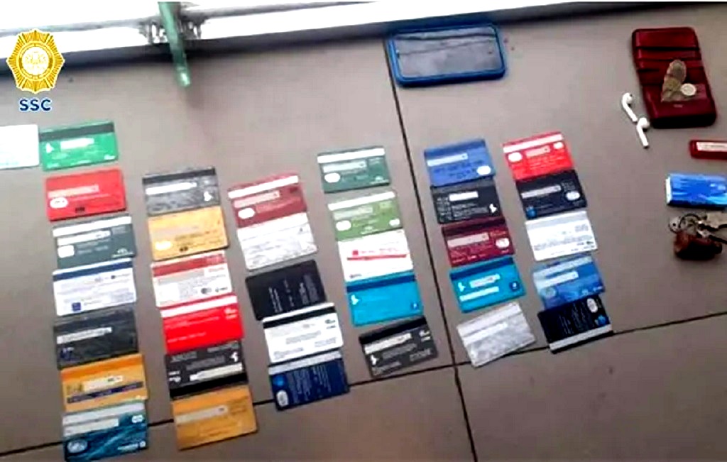 Los sospechosos intentaron abandonar el sitio. Sin embargo, los uniformados les dieron alcance para verificar la posible comisión de un delito y les realizaron una revisión preventiva, tras la cual les hallaron entre sus ropas 33 tarjetas de diferentes instituciones de las cuales no comprobaron su procedencia o legal propiedad, así como un documento de identificación del Instituto Nacional de Migración.