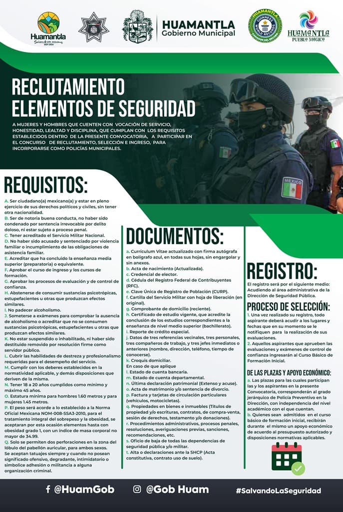 Para participar en dicha convocatoria, los interesados deberán presentarse en las oficinas de la Dirección de Seguridad Pública de Huamantla y dejar los siguientes documentos: Currículum Vitae, Acta de Nacimiento, Credencial de Elector, Cartilla Militar, Cédula del Registro Federal de Contribuyentes, entre otros.