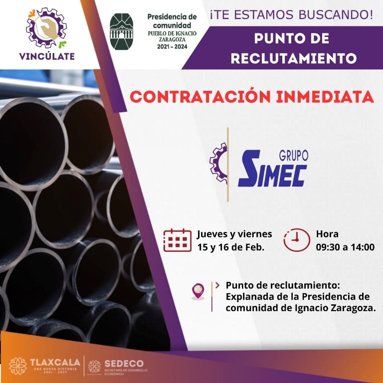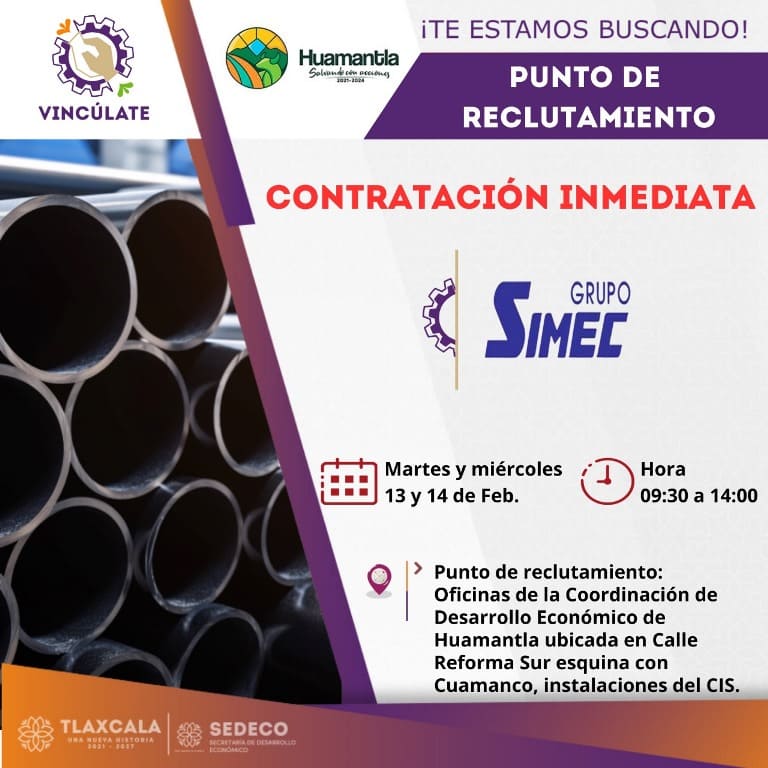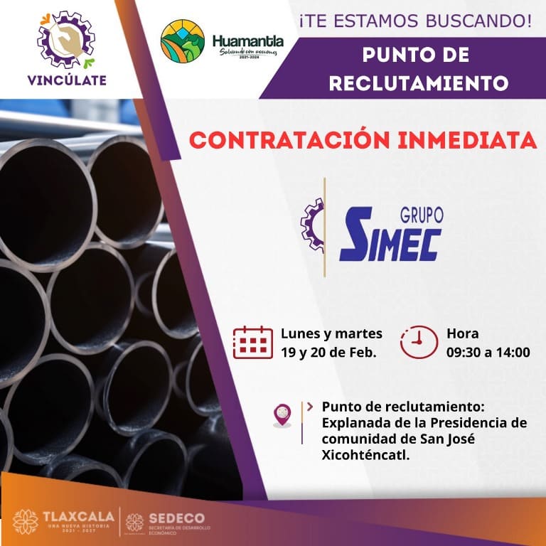 DebatePúblico.- El H. Ayuntamiento de Huamantla, encabezado por Salvador Santos Cedillo, en colaboración con el Grupo Simec, anuncia una oportunidad de empleo con contratación inmediata.