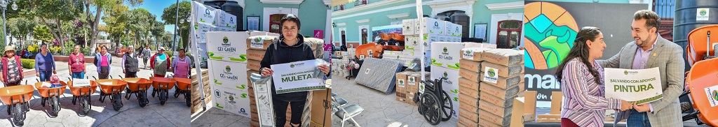 Este día, fueron entregados equipos de sonido, impresoras, carretillas, cemento, malla sombras, equipos de cómputo, láminas, mobiliario escolar, pisos, tripies para personas con diálisis, pintura, colchones, tinacos, calentadores solares, equipo deportivo, reflectores, muletas, entre otros apoyos.