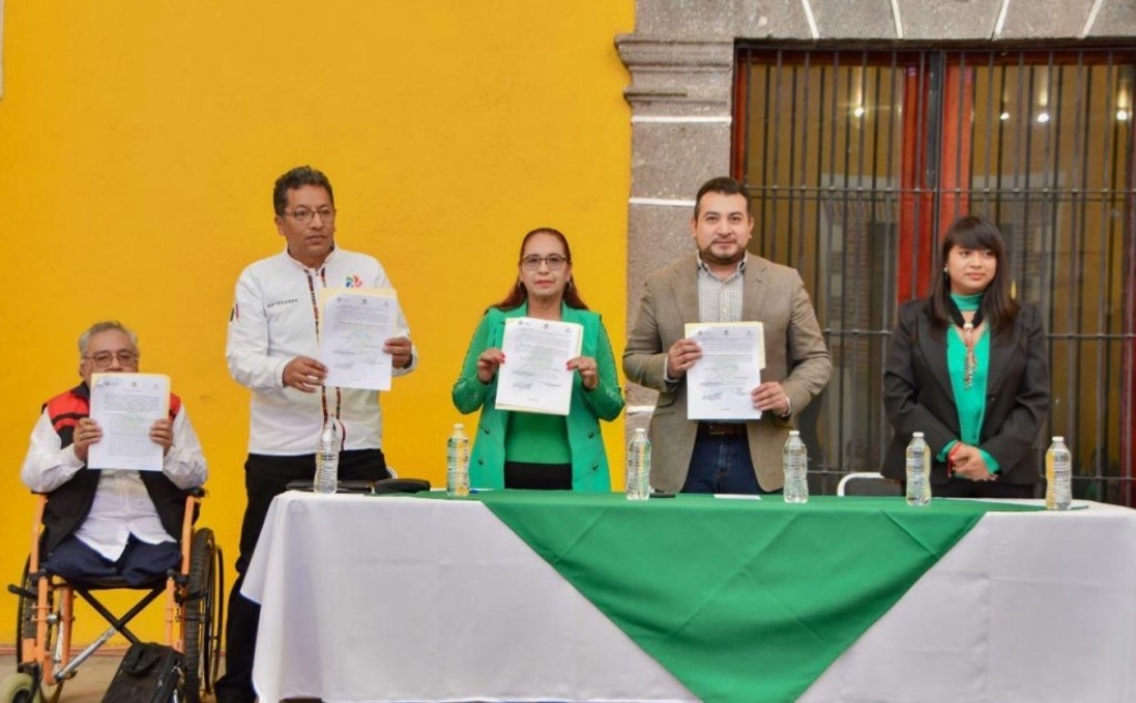 DebatePúblico.- El presidente municipal de Huamantla, Salvador Santos Cedillo, conjuntamente con autoridades del H. Ayuntamiento y el representante de los artesanos del municipio, llevaron a cabo la firma de convenio de comodato del Pabellón Artesanal del Parque Juárez.