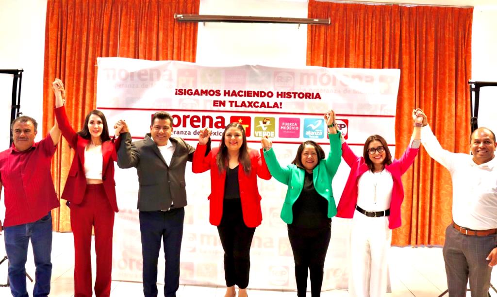 Las y los dirigentes de las seis fuerzas que conforman la alianza de candidatura común “Sigamos Haciendo Historia en Tlaxcala”, Carlos Augusto Pérez Hernández (Morena), Irma Garay Loredo (PT), Maribel León Cruz (PVEM), Reyna Flor Báez Lozano (FXM), William Zainos Flores (PANALT) y Aurora Villeda Temoltzin (RSP), coincidieron en señalar que está unidad abonará al fortalecimiento en la construcción del Segundo piso de la Cuarta Transformación.