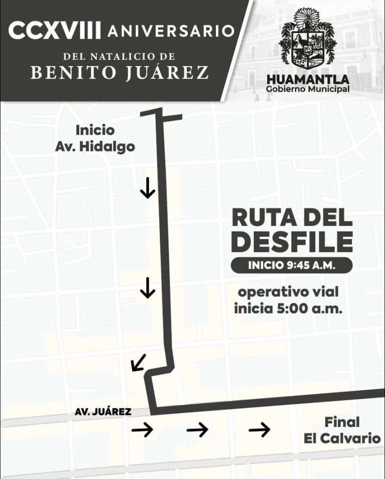 DebatePúblico.- El H. Ayuntamiento de Huamantla a través de la Dirección de Seguridad Pública, informa que con motivo del desfile cívico-escolar del 218 aniversario del Natalicio de Benito Juárez, los lugares de estacionamiento de algunas vialidades del primer cuadro de la ciudad estarán cerradas, a partir de la 5:00 de la mañana.