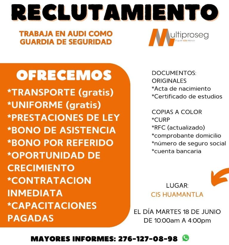 DebatePúblico.- La coordinación de Desarrollo Económico de Huamantla y empresa Multiproseg, invita a participar en la vacante de guardia de seguridad para contratación inmediata.