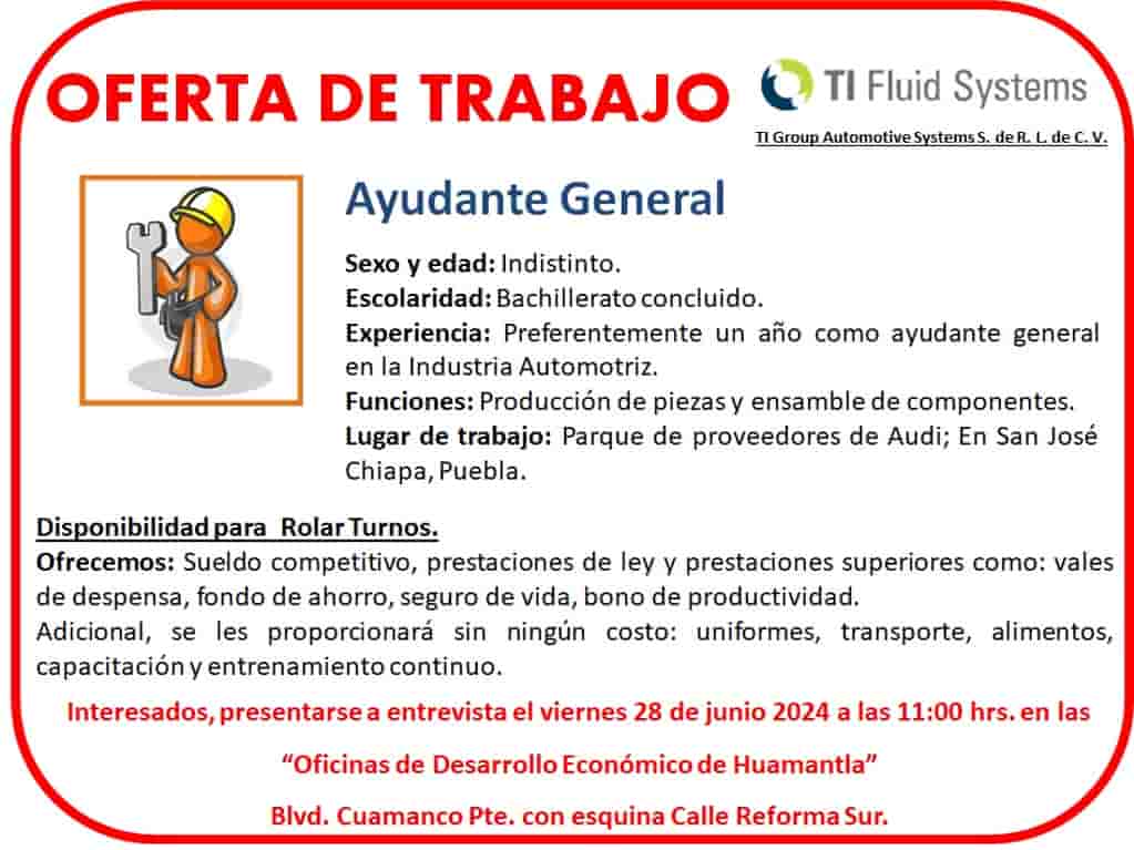 DebatePúblico.- El H. Ayuntamiento de Huamantla, que preside Luz María Calva Pimentel, en colaboración con la empresa TI Fluid Systems del ramo automotriz, anuncia que realizará reclutamiento para contratar a personal como ayudantes generales, este viernes 28 de junio.