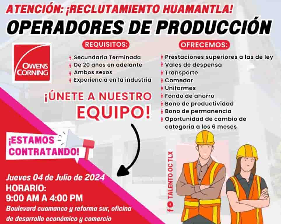 DebatePúblico.- El H. Ayuntamiento de Huamantla, invita al reclutamiento de operadores de producción de la empresa Owens Corning, que se realizará este jueves 4 de junio de 9:00 a 16:00 horas en las oficinas de la Coordinación de Desarrollo Económico de Huamantla, las cuales están ubicadas en bulevar Cuamanco esquina con Reforma S/N.