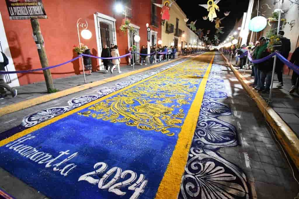 DebatePúblico.- La magia de Huamantla se vivió intensamente esta noche, cuando tanto locales como visitantes recorrieron las principales calles decoradas con coloridas alfombras de aserrín, en un homenaje a la Virgen de La Caridad durante la emblemática «Noche que Nadie Duerme».