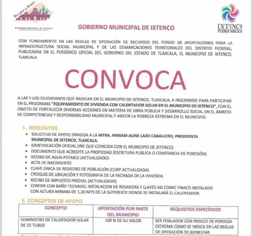El calentador sola corresponde a uno de 15 tubos y quien lo requiera tendrá que hacer su solicitud dirigida a la presidenta municipal Aline Lazo Caballero, llevar una copia de su credencial de elector, documento que acredite la propiedad en donde se instalará este calentador, además de su recibo de agua potable actualizado, acta de nacimiento, CURP actualizado, croquis de ubicación y fotografía de la fachada de la vivienda, recibo de impuesto predial actualizado, y contar con un baño techado que cuente con las conexiones de agua y tinaco.