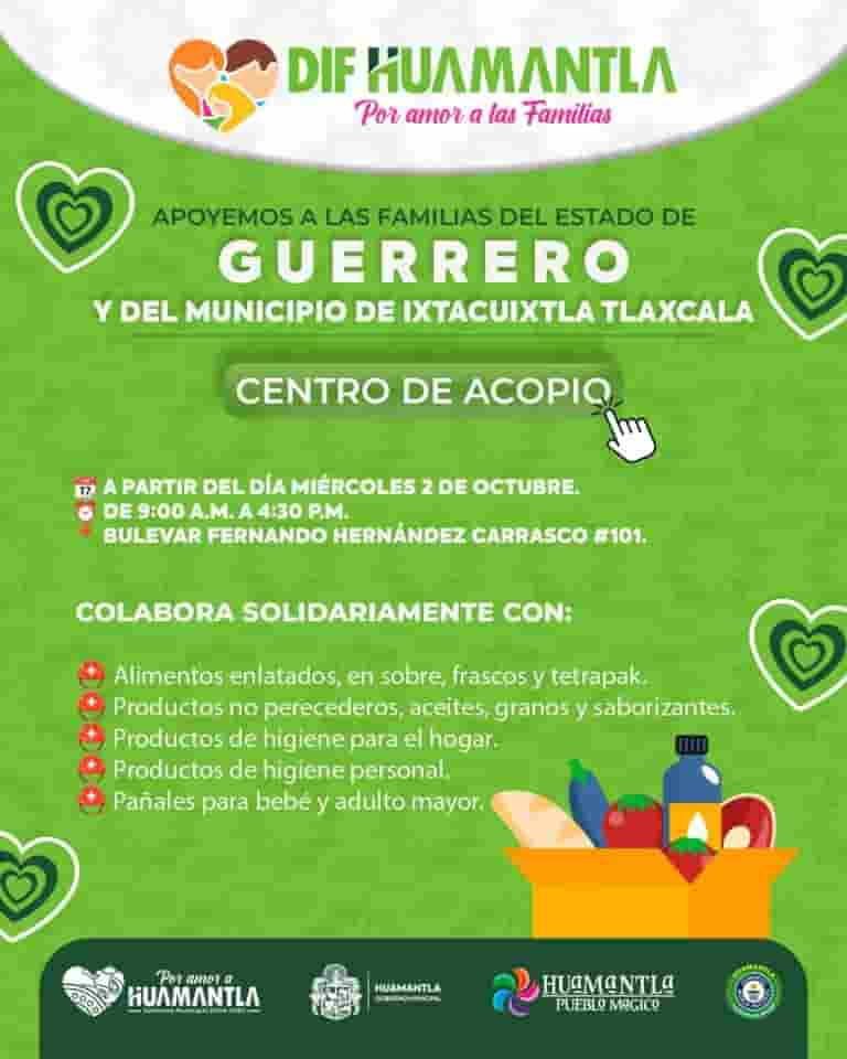 DebatePúblico.- El Sistema Municipal para el Desarrollo Integral de la Familia (SMDIF) Huamantla informa a la ciudadanía que ha habilitado sus instalaciones como Centro de Acopio, para apoyar a los damnificados del estado de Guerrero y del municipio de Ixtacuixtla Tlaxcala, afectados por las recientes y fuertes lluvias.