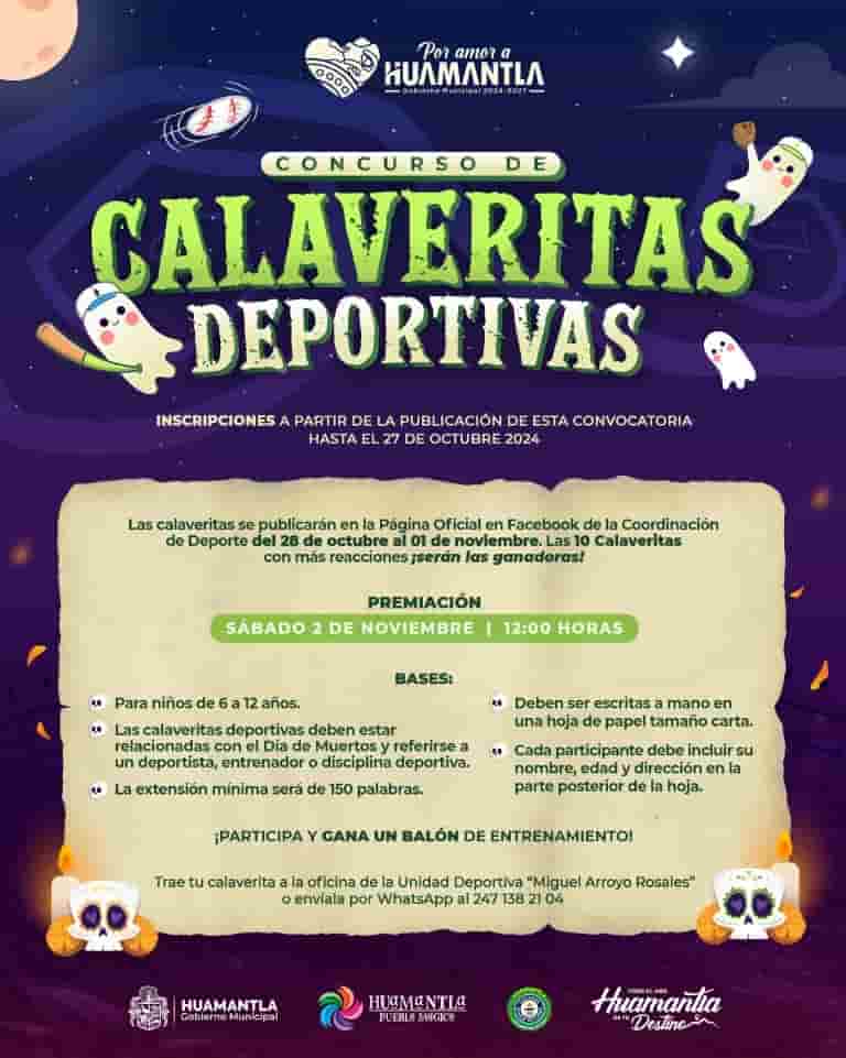 DebatePúblico.- El Ayuntamiento de Huamantla, a través de la Coordinación del Deporte, abrió una convocatoria dirigida a niñas y niños de entre 6 y 12 años para que participen en el Concurso de «Calaveritas Deportivas», actividad que busca fomentar la creatividad y el amor por el deporte en los menores, en el marco de las celebraciones del Día de Muertos.