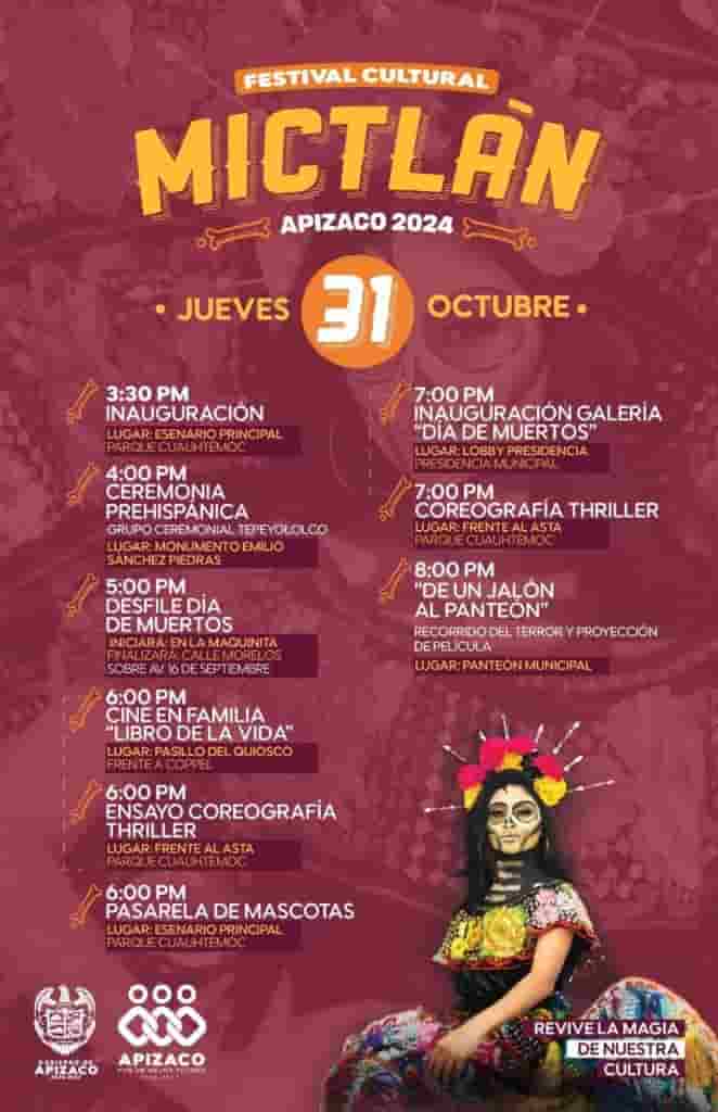 DebatePúblico.- El H. Ayuntamiento de Apizaco, encabezado por Javier Rivera Bonilla, en colaboración con la Coordinación de Cultura, invitan al Festival Cultural Mictlán Apizaco 2024 que se llevará a cabo el jueves 31 de octubre y viernes 01 de noviembre.
