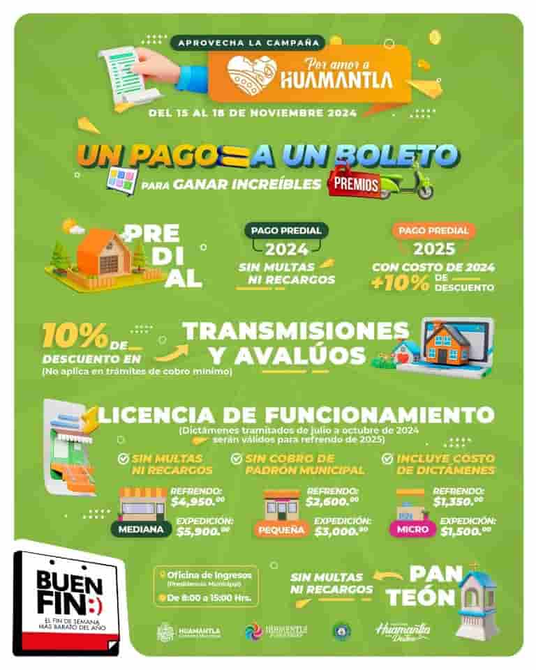 DebatePúblico.- El Ayuntamiento de Huamantla invita a toda la población a aprovechar los descuentos y exenciones especiales del “Buen Fin”, en una jornada especial que se llevará a cabo desde el viernes 15 y hasta el lunes 18 de noviembre, con un horario de 8:00 a 15:00 horas, y que aplicará en los pagos de diversos trámites y servicios municipales, que incluyen Predial, Avalúos y Transmisiones, así como licencias de funcionamiento y servicios de panteones.