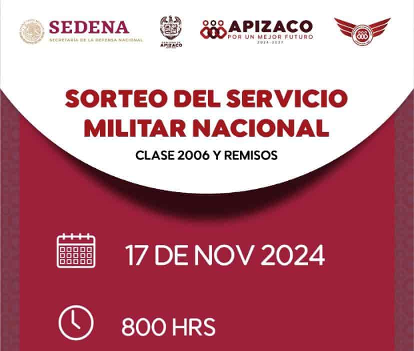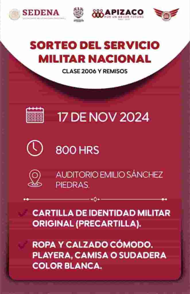 DebatePúblico.- La Secretaría de la Defensa Nacional, a través de la 23/a. Zona militar informa a los jóvenes que obtuvieron su cartilla de identidad militar en el presente año, clase “2006” y remisos, que el Sorteo del Servicio Militar Nacional se llevará a cabo a las 09:00 horas del día 17 de noviembre del 2024, la cita será a las 8:00 am en el Auditorio Emilio Sánchez Piedras.