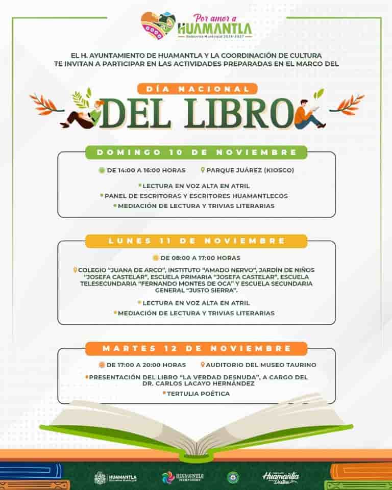 DebatePúblico.- En el marco del Día Nacional del Libro, y con el propósito de promover la lectura y acercar a la población al conocimiento y entretenimiento, el Gobierno de Huamantla ha preparado una serie de actividades especiales del 10 al 12 de noviembre, diseñadas para enriquecer el ambiente cultural y literario del municipio.