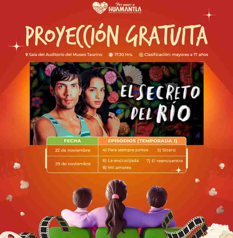 DebatePúblico.- Para promover las actividades culturales y lúdicas entre las nuevas generaciones, el Gobierno Municipal de Huamantla invita a toda la población mayor de 17 años a la proyección gratuita de la serie “El secreto del río”, los próximos viernes 22 y 29 de noviembre, a las 17:30 horas, en la sala del auditorio del Museo Taurino.