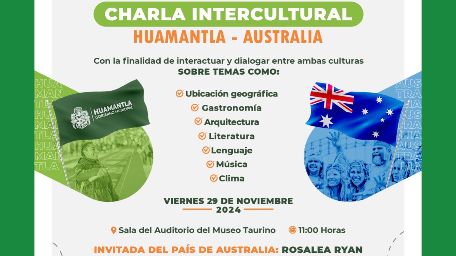 DebatePublico.- Como una forma de crear espacios para compartir ideas y celebrar las diferencias culturales, el Gobierno Municipal de Huamantla, a través de la Coordinación de Cultura, invita a la población en general a participar en la “Charla Intercultural México – Australia”, que tendrá lugar este viernes 29 de noviembre, a las 11:00 horas, en la sala del auditorio del Museo Taurino.