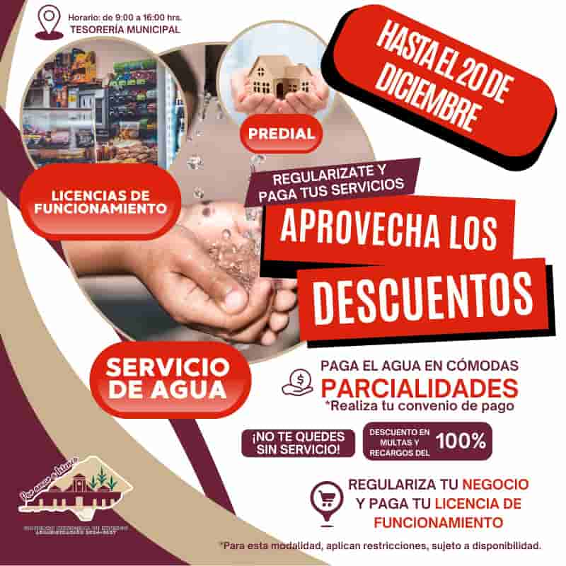 El área de tesorería Municipal ofrece descuentos de hasta el 100% en multas y recargos de pago del impuesto predial y para los ciudadanos que deban más de 10 años, el beneficio será que solo pagarán los últimos 5 años, para el caso del pago del formato único para licencias de funcionamiento para nuevos negocios y/o refrendos de la misma, el dictamen de Protección Civil será subsidiado al cien por ciento por la administración municipal, para este caso los negocios que accedan a este beneficio deberán de presentar sus pagos de agua y predial al corriente.