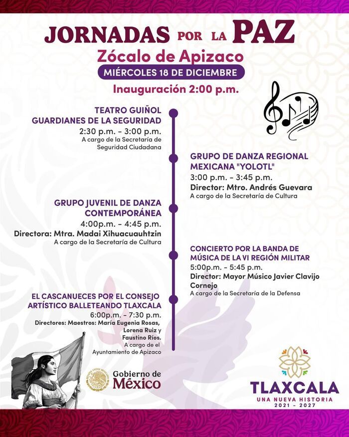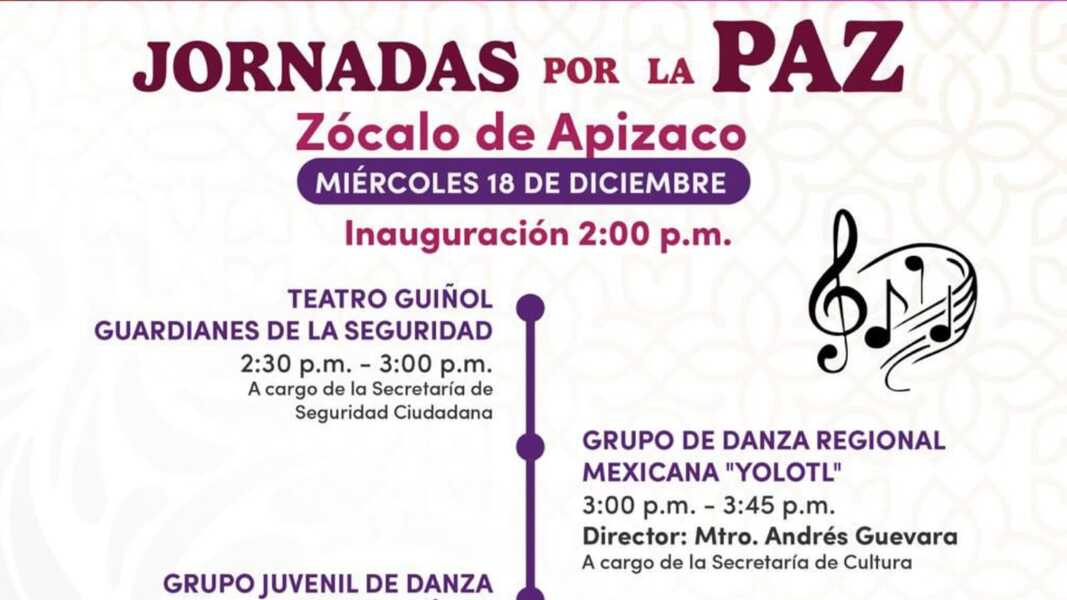 Debatepúblico por ManuelRojas.- Este jueves 16 de diciembre en punto de las 2:00 pm se llevará a cabo la inauguración de las actividades de las Jornadas por la Paz, a cargo de la Secretaría de Seguridad Ciudadana, Secretaría de Cultura, Secretaría de Defensa y el H. Ayuntamiento de Apizaco para promover la paz en nuestro municipio.