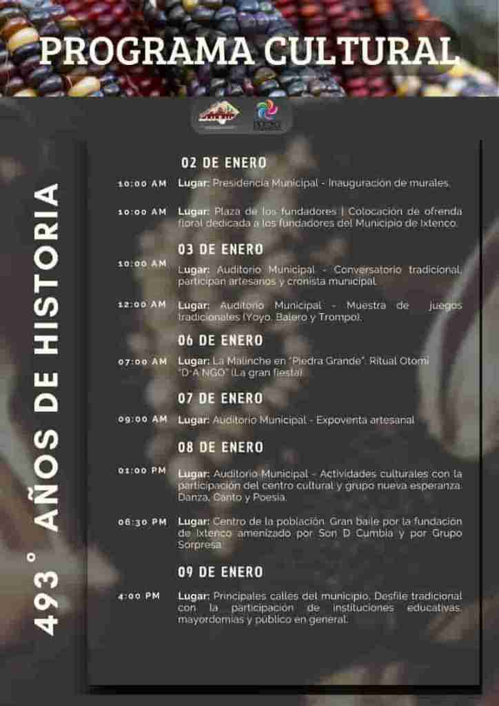 - 08 de enero: Actividades culturales con danza, canto y poesía, y gran baile por la fundación de Ixtenco en el Centro de la población.