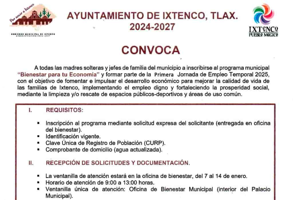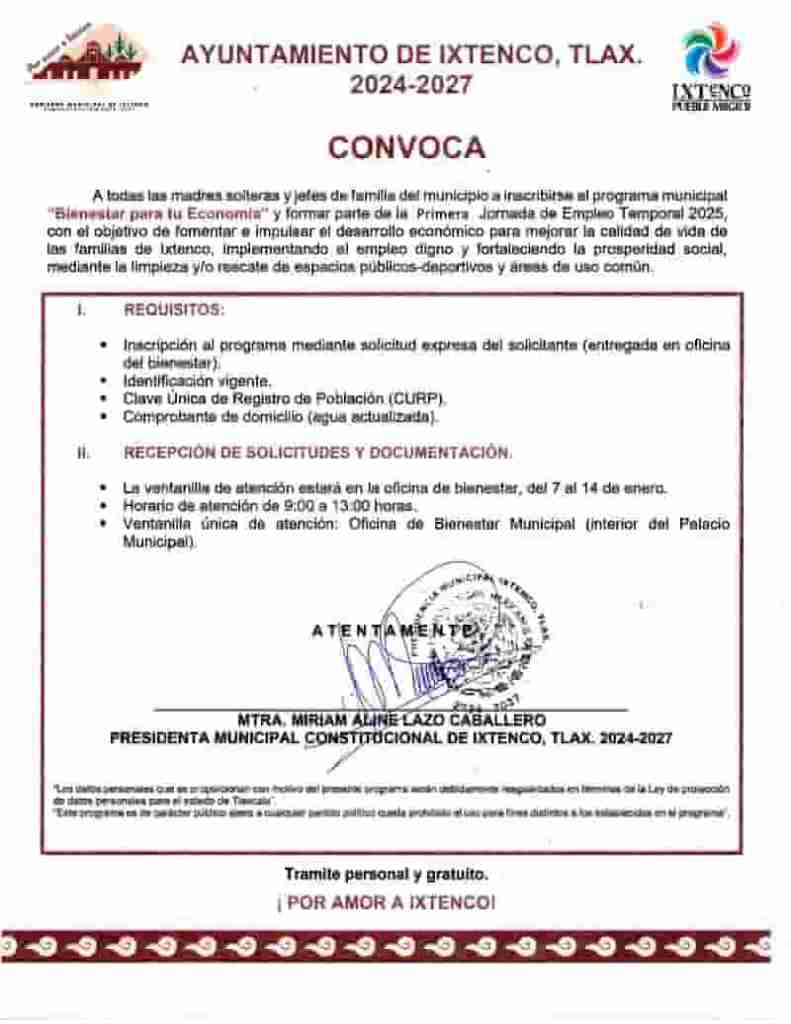 DebatePúblico.- El Ayuntamiento de Ixtenco, presidido por Aline Lazo Caballero, invita a todas las madres solteras y jefes de familia del municipio a participar en el programa municipal «Bienestar para tu Economía», como parte de la Primera Jornada de Empleo Temporal 2025.