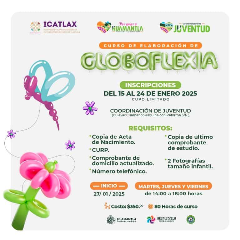 DebatePúblico.- La Coordinación de Juventud de Huamantla, en colaboración con el Instituto de Capacitación para el Trabajo del Estado de Tlaxcala (Icatlax), invita a todos los jóvenes del municipio a inscribirse en el curso de Globoflexia, que iniciará el próximo 27 de enero.