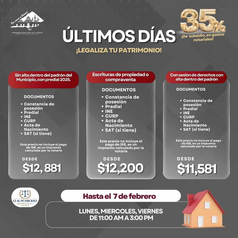 Para llevar a cabo el trámite, solo es necesario acudir a nuestras oficinas, donde recibirás toda la asesoría necesaria para completar el proceso de manera sencilla y eficiente. Esta campaña es posible gracias a la colaboración con el despacho jurídico Leal Petriciole.