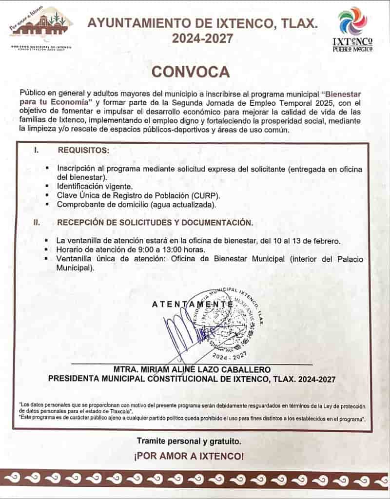El Ayuntamiento de Ixtenco reitera su compromiso con la mejora del bienestar social, el fomento de la prosperidad local y la creación de empleos dignos para sus habitantes. La participación de la ciudadanía es esencial para seguir fortaleciendo el crecimiento y desarrollo de Ixtenco, un Pueblo Mágico lleno de historia, tradición y comunidad.