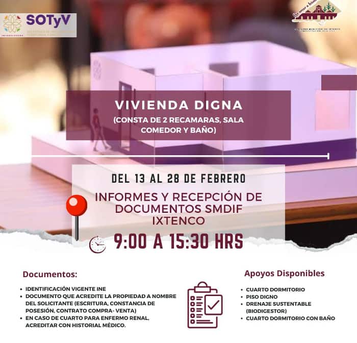 Las personas interesadas en acceder a estos beneficios deberán presentar su documentación en las oficinas del SMDIF Ixtenco, en un horario de 9:00 a 15:30 horas, del 13 al 28 de febrero.