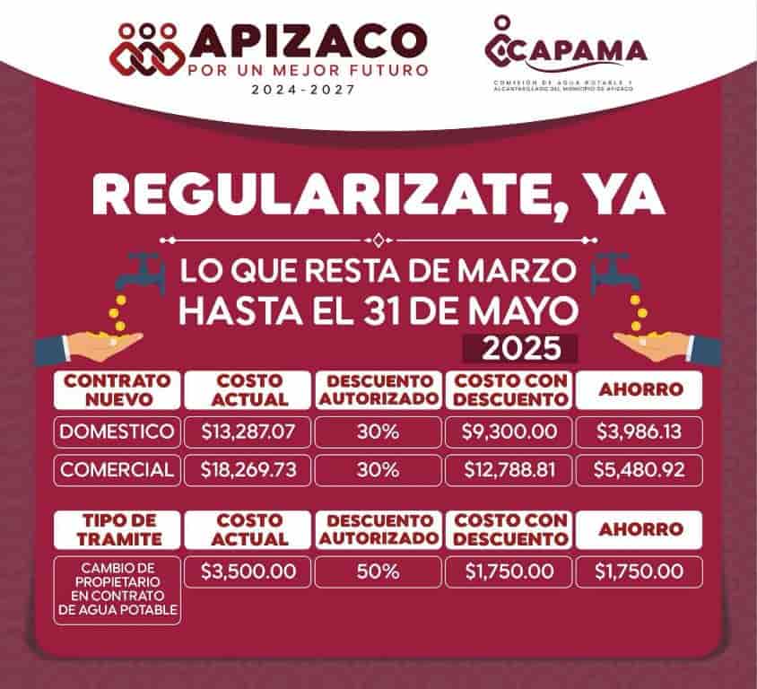DebatePúblico.- El Gobierno de Apizaco, encabezado por el presidente municipal Javier Rivera Bonilla, a través de la Comisión de Agua Potable y Alcantarillado (CAPAMA), dio a conocer el programa “REGULARÍZATE YA”, el cual estará vigente del 14 de marzo al 31 de mayo del 2025.