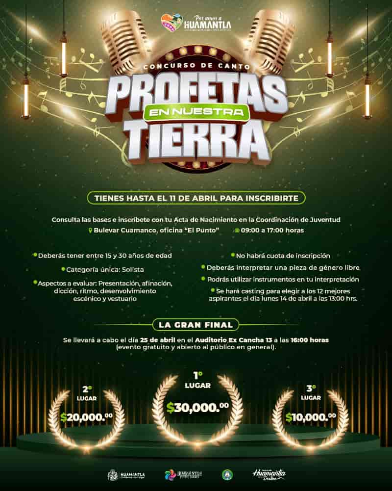 DebatePúblico.- Como una forma de fortalecer el impulso al talento artístico juvenil y consolidar a Huamantla como un referente cultural, el Presidente Municipal Salvador Santos Cedillo anunció una gran bolsa de premios para los ganadores del concurso de canto “Profetas en Nuestra Tierra”.
