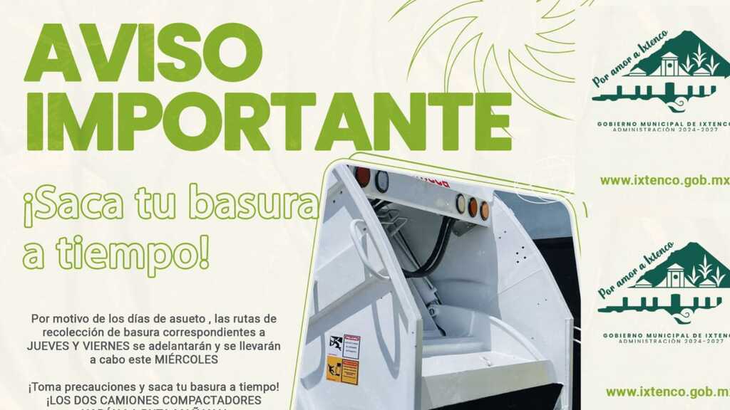 DebatePúblico.- El H. Ayuntamiento de Ixtenco informa a la ciudadanía que, por motivo de los días de asueto (jueves y viernes santo), las rutas de recolección de basura correspondientes a esos días se adelantarán y se llevarán a cabo este miércoles.
