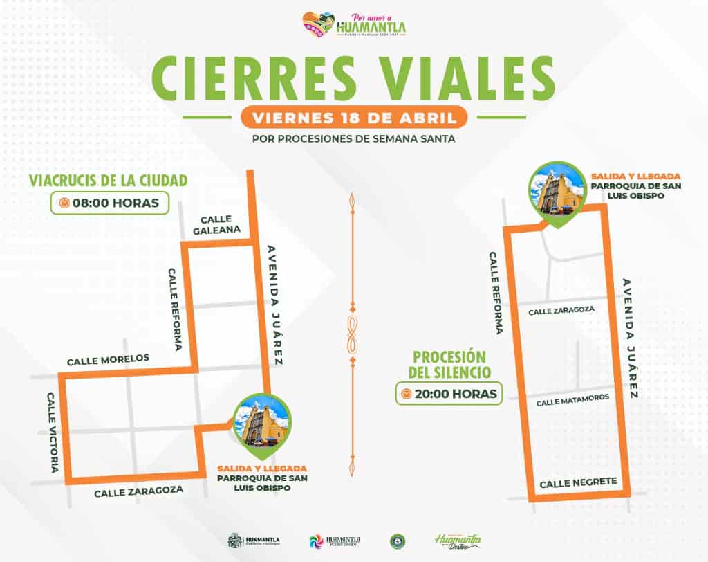 DebatePúblico.- Con motivo de las actividades eclesiásticas programadas para este Viernes Santo en Huamantla, el Gobierno Municipal informa a la ciudadanía que se realizarán cortes de circulación en diversas calles del centro de la ciudad, por lo que se invita a peatones, automovilistas y transportistas a considerar sus tiempos de traslado y tomar rutas alternas.