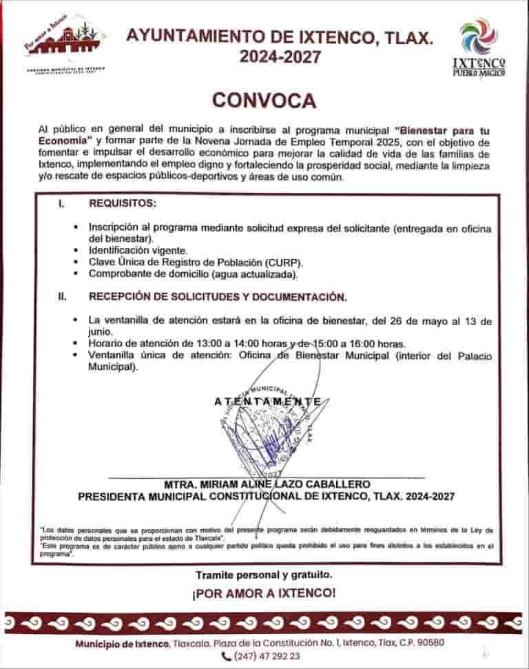 DebatePúblico.- El Gobierno Municipal de Ixtenco, que encabeza Aline Lazo Caballero, convoca a la ciudadanía a inscribirse al programa “Bienestar para tu Economía”, como parte de la Novena Jornada de Empleo Temporal 2025, cuyo objetivo es fomentar el empleo digno y fortalecer la economía local.