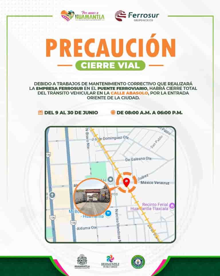 DebatePúblico.- Para preservar la seguridad de la población y garantizar el mantenimiento correcto de la infraestructura urbana, el Gobierno Municipal de Huamantla informa a la ciudadanía que se llevará a cabo el cierre temporal de la calle Abasolo Oriente, en la colonia San Sebastián, debido a los trabajos de rehabilitación del puente ferroviario, que llevará a cabo la empresa Ferrosur.