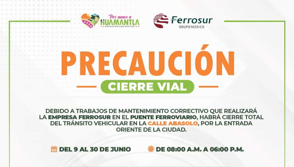 DebatePúblico.- El Gobierno Municipal de Huamantla informa que a partir de este lunes 9 de junio dará inicio un operativo especial de vialidad por el cierre temporal de la calle Abasolo Oriente, en la colonia San Sebastián, con motivo de los trabajos de rehabilitación del puente ferroviario que llevará a cabo la empresa Ferrosur.