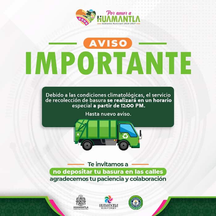DebatePúblico.- La Coordinación de Servicios Públicos informa que, debido a las condiciones climáticas y a que el relleno sanitario no está recibiendo camiones por las lluvias, el servicio de recolección de basura sufrirá un ajuste en su horario habitual.