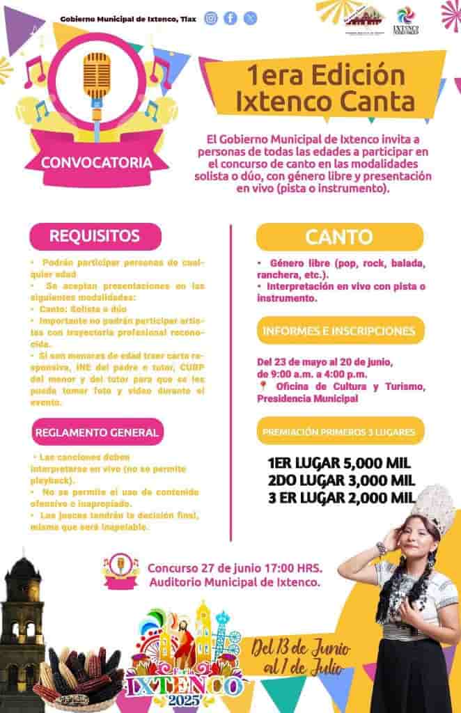 DebatePúblico.- El Gobierno Municipal de Ixtenco, que encabeza Aline Lazo Caballero, a través de la Dirección de Cultura que dirige David Albañil Vásquez, informó que se incrementó la bolsa de premios del concurso “Ixtenco Canta”, en su primera edición, como parte de las actividades de la Feria Patronal Ixtenco 2025.