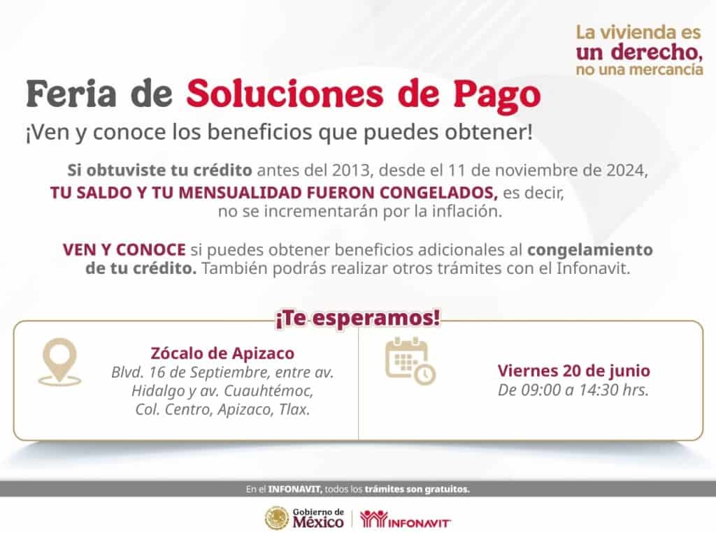 DebatePúblico.- El Gobierno municipal de Apizaco en coordinación con el Instituto del Fondo Nacional de la Vivienda para los Trabajadores (Infonavit) en Tlaxcala, invita a las y los derechohabientes del municipio a participar en la Feria de Soluciones de Pago, un evento diseñado para brindar apoyo a personas con créditos activos.