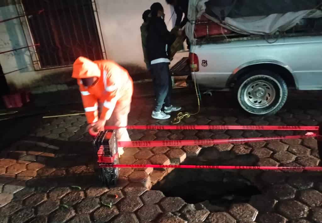 El incidente fue reportado en la calle 10 de Abril, a espaldas de la Casa del Campesino, donde se detectó un hundimiento de aproximadamente 80 centímetros de profundidad y 1.5 metros de diámetro.
